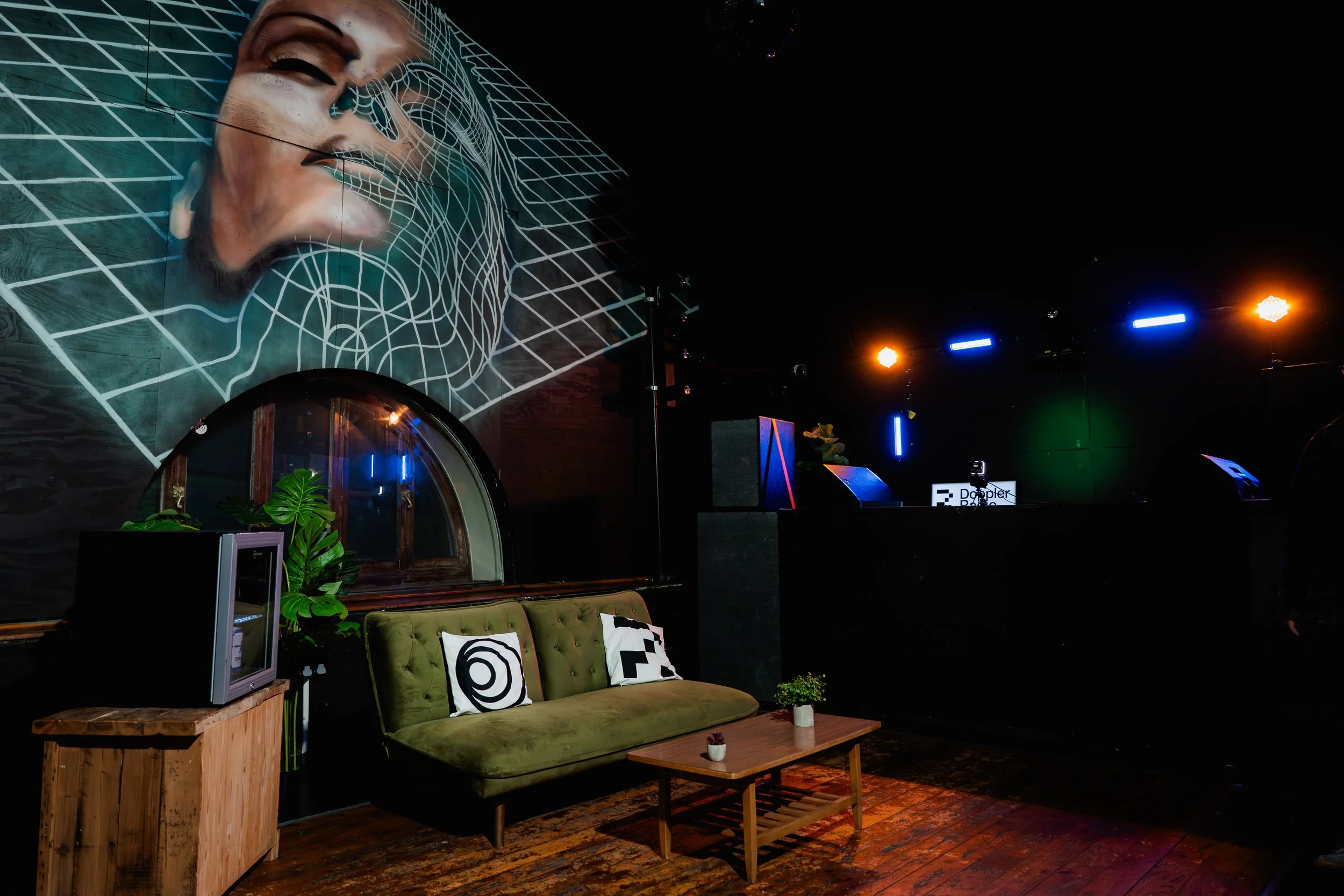 You’ve got a sofa area, a beer fridge for refreshments, and Pioneer DJ setup: 2x CDJ-3000s, a DJM-9 mixer, and 2x monitors for clean booth sound.